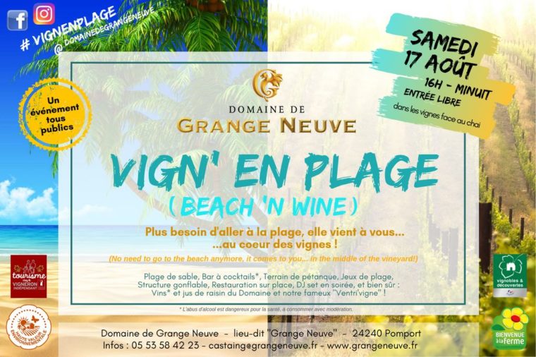 Plus besoin d’aller à la plage, elle vient à vous… au cœur des vignes de Grange Neuve ! Préparez la paire de tongs et le chapeau de paille, on s’occupe du reste : plage de sable, bar à cocktails, terrain de pétanque, jeux de plage, structure gonflable, foodtrucks, DJ set en soirée et, bien sûr, vins et jus de raisin du Domaine et notre fameux « Ventri’vigne » !