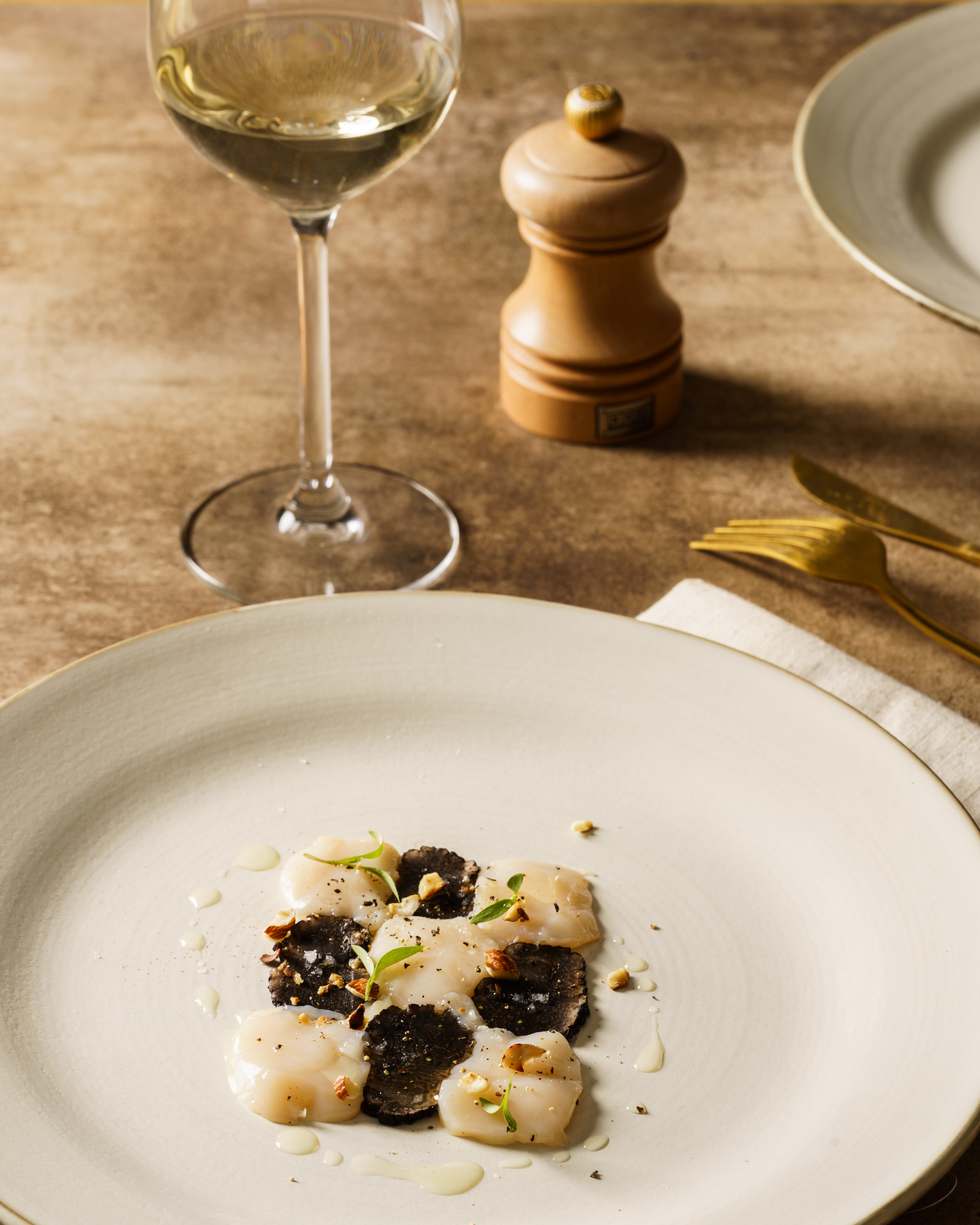 Dans une belle assiette plate, intercalez tranches de truffe et tranches de Saint-Jacques afin de reconstituer un damier.
