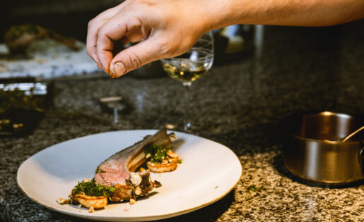 Dans une cocotte, ajouter de l’huile d’olive et du beurre. Faire colorer le carré d’agneau de tous les côtés. Le retirer du feu et le déposer dans un plat ou une plaque à four.