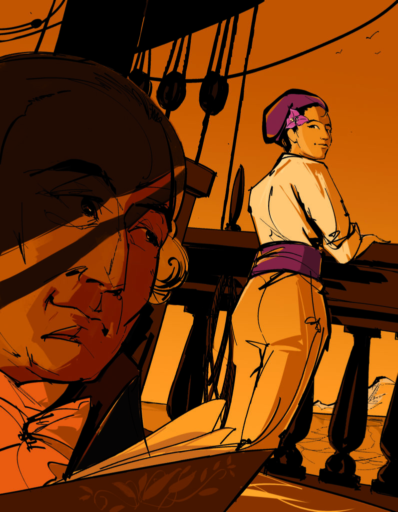 Pour suivre son pygmalion, Jeanne Barret, déguisée en homme n’hésite pas à embarquer clandestinement à bord de l’Étoile, qui met le cap sur l’Amérique latine. En effet, il était à l’époque interdit d’emmener une femme à bord ! Elle joue donc le rôle de valet, en parcourant les rivages pour faire les cueillettes et ainsi aider son bien aimé professeur. Tous deux vont s’extasier sur la luxuriance de la flore sud-américaine et ils n’auront de cesse de l’inventorier. On leur doit parmi de nombreuses découvertes, celle d’une liane fleur qu’ils baptiseront le « bougainvillée ». Mais le stratagème de Jeanne sera dévoilé lors d’une escale à Tahiti, mettant fin à sa collaboration clandestine. Elle continue tout de même son trajet à bord de l’expédition jusqu’à s’établir sur l’Isle de France, ancien nom de l’Île Maurice, avec son compagnon. L’intrépide aventurière, pleine de ressources, révèle un talent de femme d’affaires avisée en ouvrant un cabaret à Port Louis.