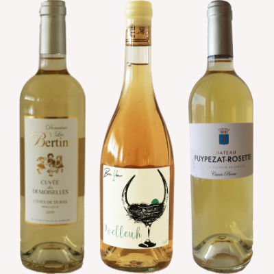 des Demoiselles, aux fragrances de fruit de la passion et de goyave. Sur le même thème, les Côtes de Montravel ne sont pas en reste avec leur Château Pique-Sègue, où l’ananas côtoie la poire et le bourgeon de cassis. Vendangée à la main, la Cuvée du Château Puypezat-Rosette offre une belle intensité, entre gras et fraîcheur, signe d’un Rosette très élégant. Les Côtes de Bergerac recèlent des pépites, comme le Moelleuh du Domaine de Bonvin, élaboré en biodynamie, dont le nom et l’étiquette prouvent que l’on peut faire de l’excellent vin avec humour !